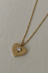 14k yellow gold ribbed heart-shaped charm with 2mm round white diamond and 18" cable chain.
